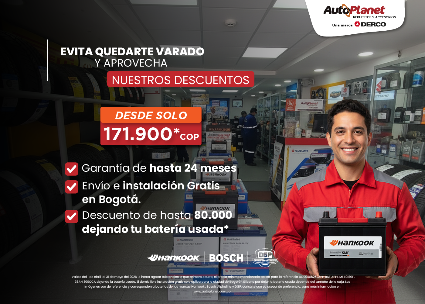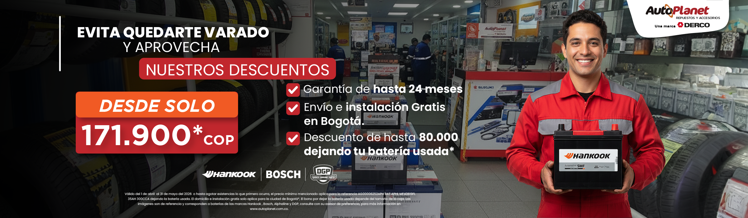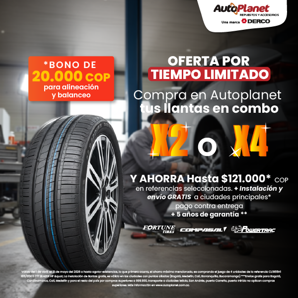 DERCO Colombia presenta AUTOPLANET el ecommerce especializado en la venta de productos, accesorios y repuestos para vehículos. En nuestra tienda online podrás comprar llantas, baterías, productos de limpieza, accesorios de seguridad e iluminación, kit de seguridad, aceites y lubricantes, amortiguadores y mucho más, de las mejores marcas y a precios competitivos. Sé parte de la familia DERCO y disfruta de nuestro envío a domicilio en toda Colombia.
