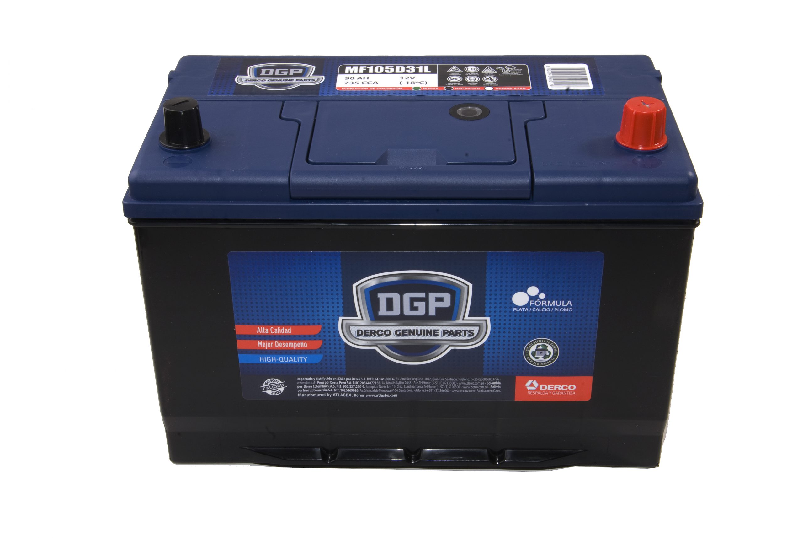 Batería DGP tipo MF caja 27-1100 para automóvil modelo MF105D31L 90AH 1100CA. Borne positivo derecho. Peso: 20.8 kg, Dimensiones 30.2 × 17.2 × 22 cm, capacidad – Ampere Hora: 90, arranque en frío: 1100. Tecnología X-FRAME, fabricadas con los más altos estándares de calidad ISO. Mayor tiempo de duración, para un mejor rendimiento. 100% libre de mantención. Origen: Corea, se estableció en el año 1944, distribuida en más de 130 países en todo el mundo.