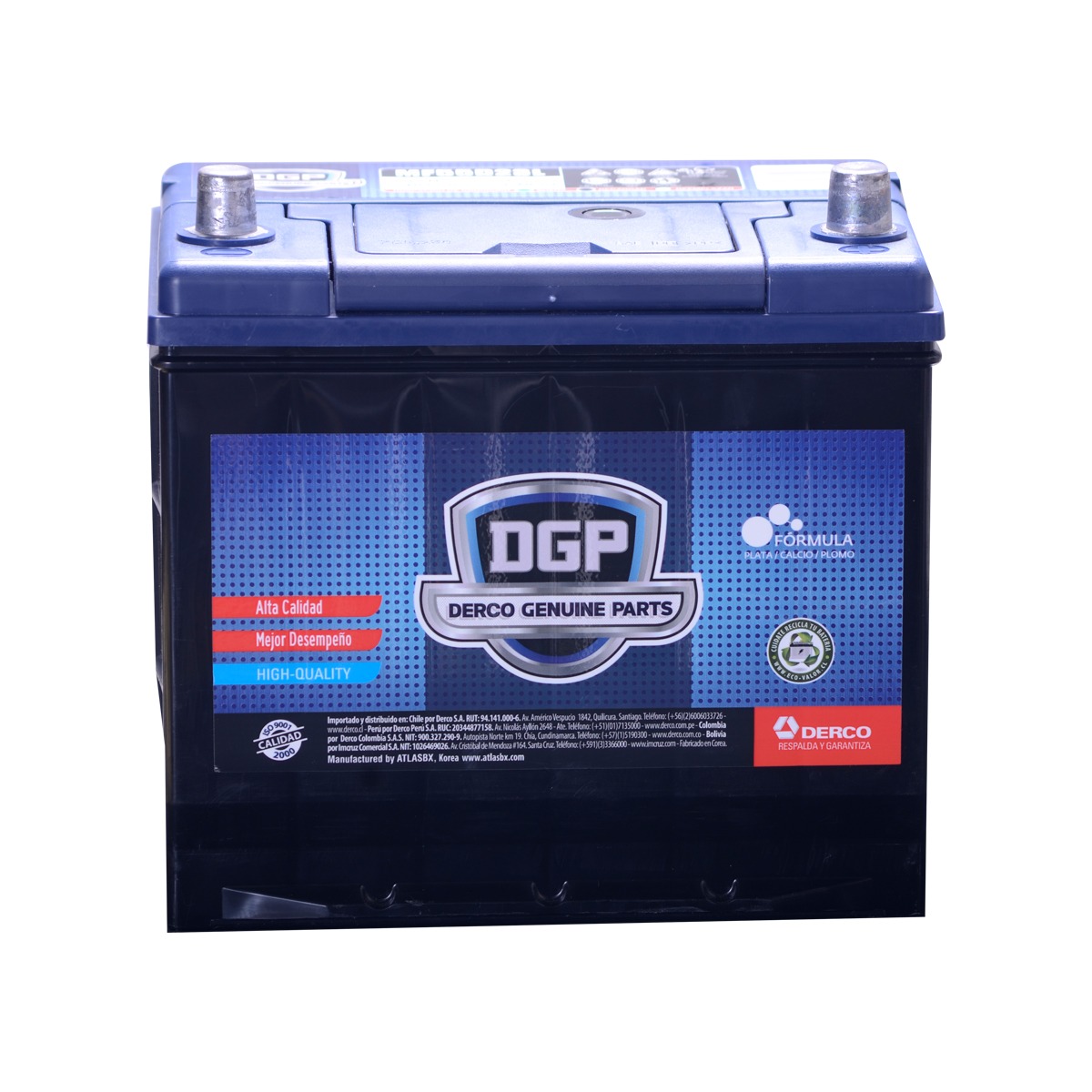 Batería DGP tipo MF caja 35 para automóvil modelo MF55D23L 60AH 760CA. Borne positivo derecho. Peso: 15.1 kg, Dimensiones 23 × 17.2 × 22 cm, capacidad – Ampere Hora: 60, arranque en frío: 510. Tecnología X-FRAME, fabricadas con los más altos estándares de calidad ISO. Mayor tiempo de duración, para un mejor rendimiento. 100% libre de mantención. Origen: Corea, se estableció en el año 1944, distribuida en más de 130 países en todo el mundo.