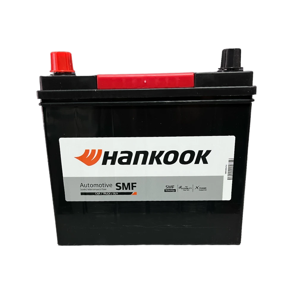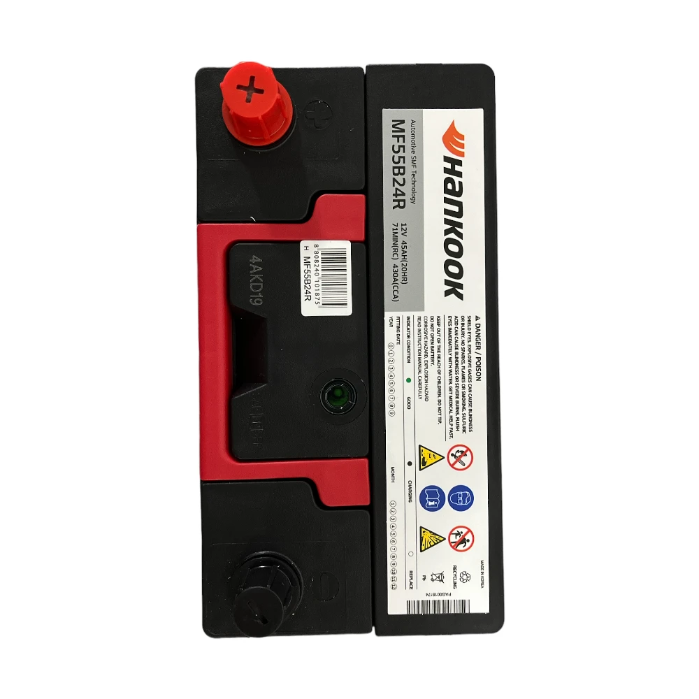 Batería Hankook tipo MF caja N40I-650 para automóvil modelo MF55B24R 45AH 650CA. Borne positivo izquierdo. Peso: 11.8 kg, Dimensiones 23.4 × 12.7 × 22 cm, capacidad – Ampere Hora: 45, arranque en frío: 650. Tecnología X-FRAME, fabricadas con los más altos estándares de calidad ISO. Mayor tiempo de duración, para un mejor rendimiento. 100% libre de mantención. Origen: Corea, se estableció en el año 1944, distribuida en más de 130 países en todo el mundo.
