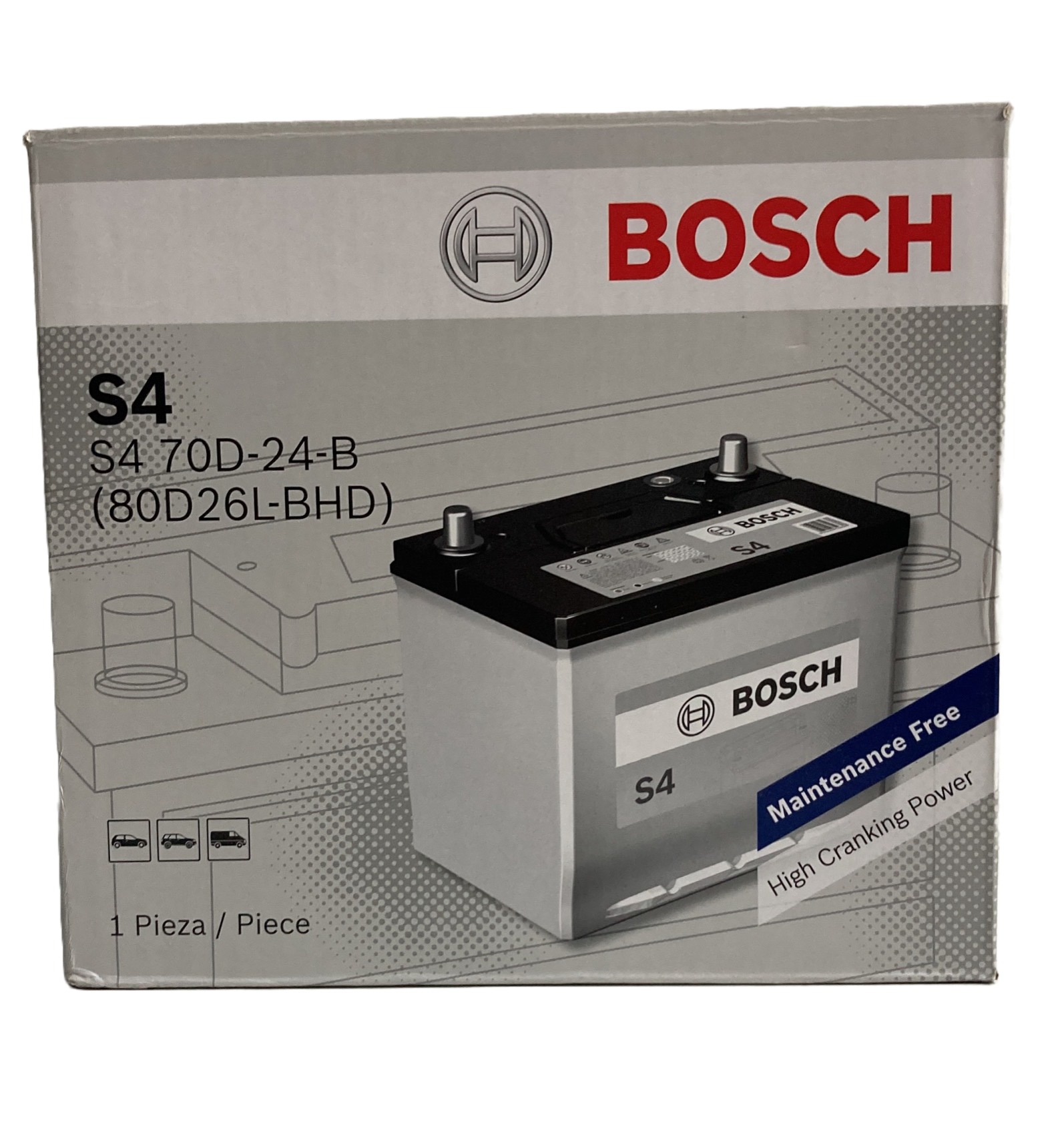 Batería Bosch tipo S4 caja 34-900 para automóvil modelo 80D26L 70AH 900CA. Borne positivo DERECHO.