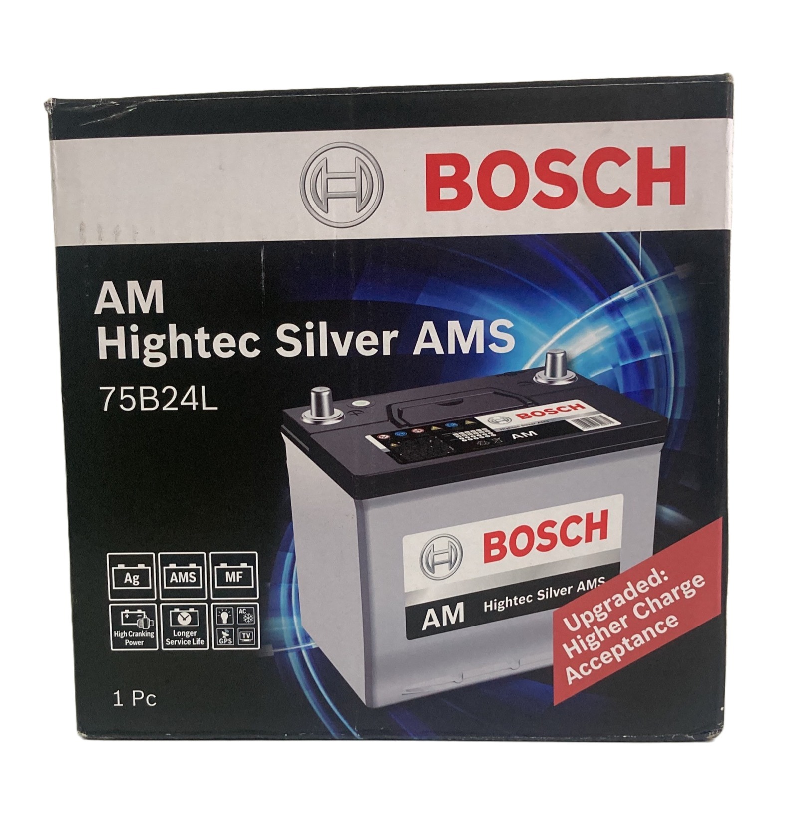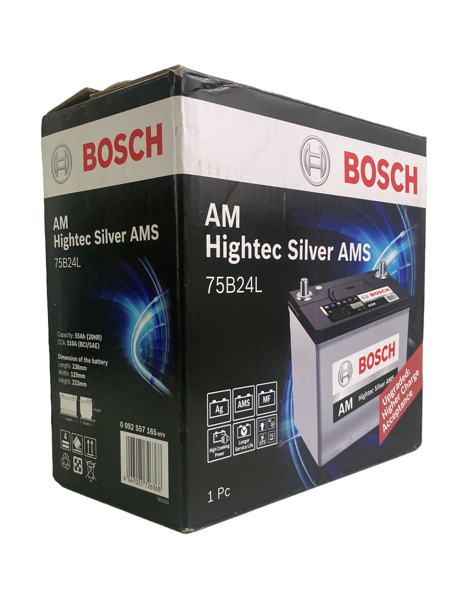 Batería Bosch tipo AMS caja N60-765 para automóvil modelo 75B24L 55AH 765CA. Borne positivo DERECHO.