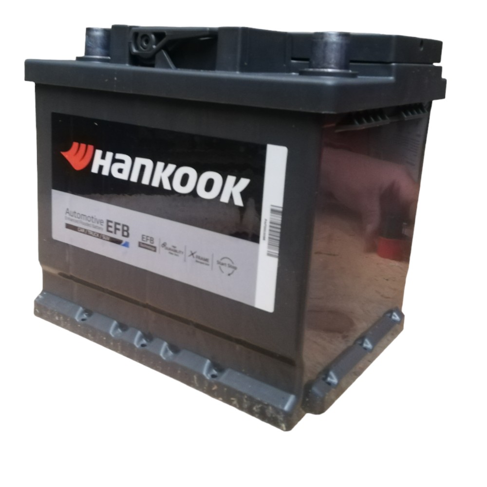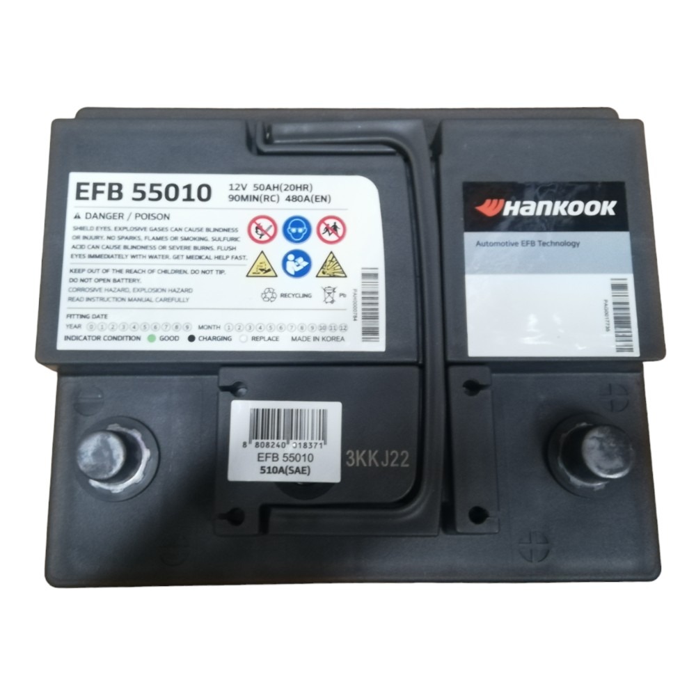 Batería HANKOOK tipo EFB para automóvil híbrido modelo 55010 55AH 480CCA CJL1. Borne positivo derecho., capacidad – Ampere Hora: 50, arranque en frío: 480. Las Baterías HANKOOK, son baterías selladas y de libre mantención, con un alto performance en el arranque en frio, poseen la tecnología XFRAME, la cual otorga al producto mayor rendimiento y optimizando